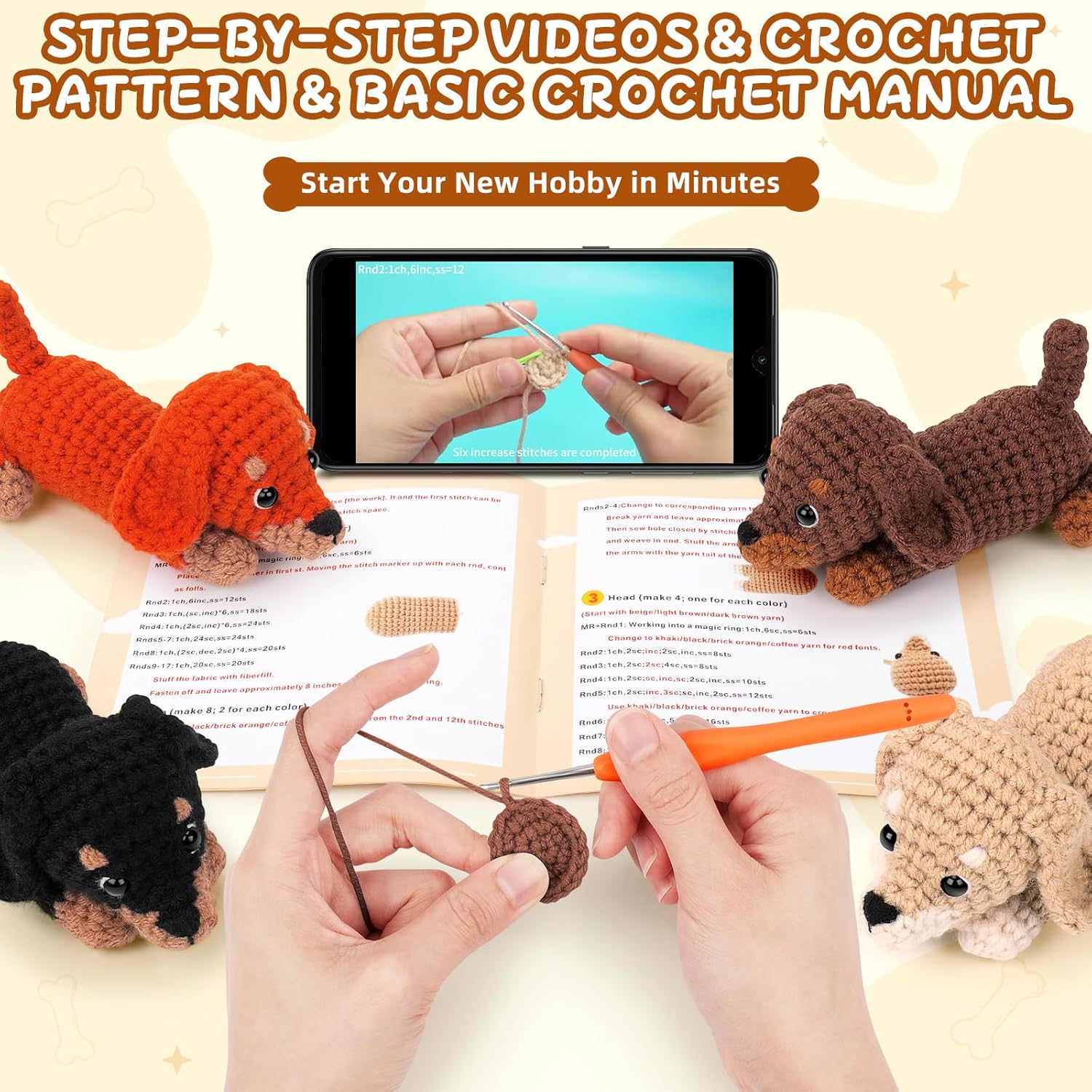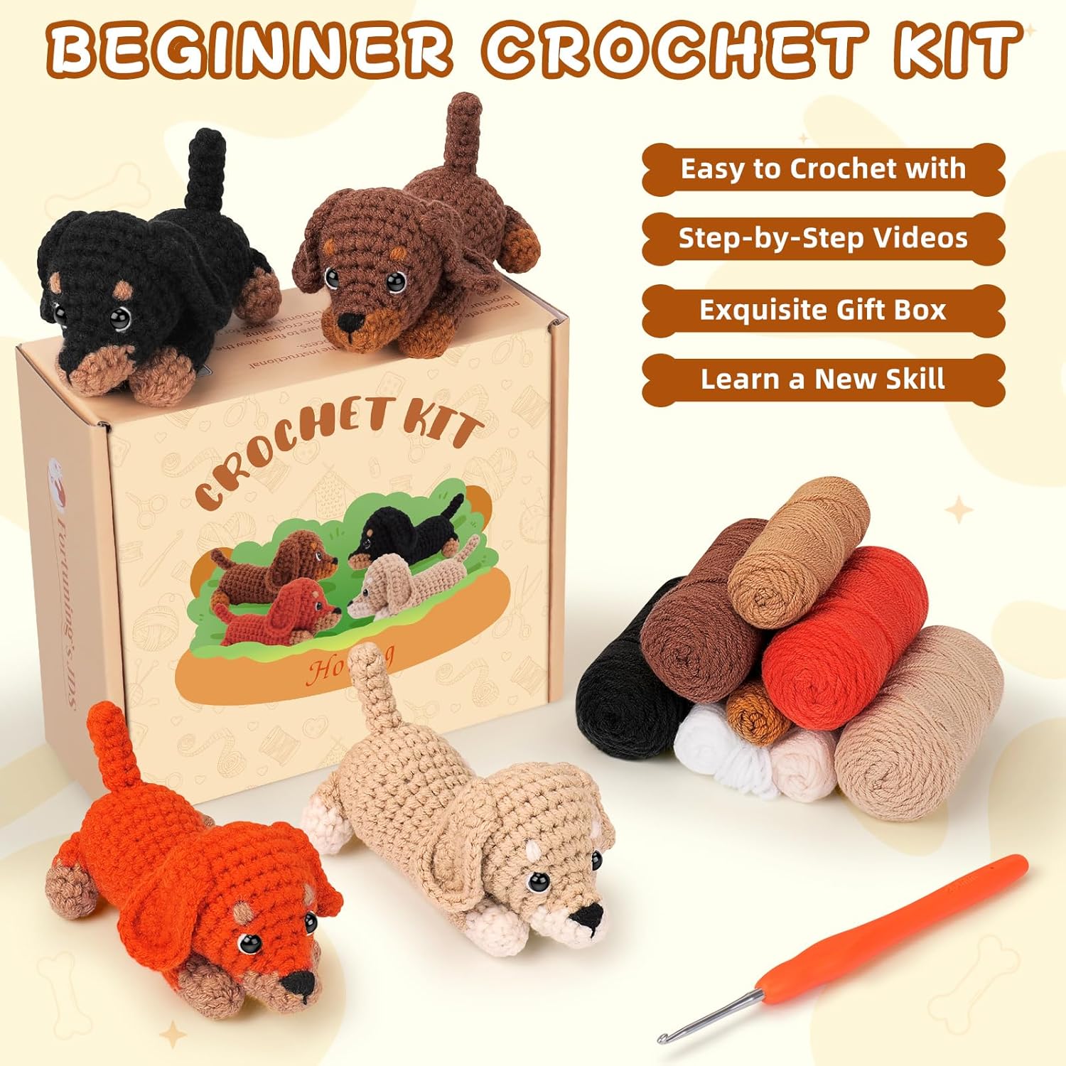Crochet Animal Kit: Our starter crochet kit includes materials to create 4 adorable dachshund puppies in different vivid colors! Perfect for a family craft night, sharing with friends, or building your own sausage dog squad. It’s the ultimate value crochet set for dog lovers who want more fun in one box.